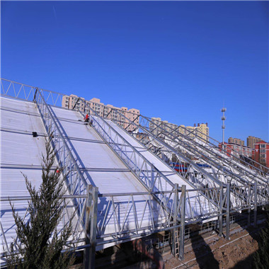 这也是污水池加盖膜结构受欢迎的重点缘故。 膜结构是建筑结构中新发展起来的一种模式,它以功能良好的织物为原料,或是向膜内充气,由空气压力维持膜面,或是诈骗柔性钢索或刚性维持结构将面绷紧,从而造成拥有肯定刚度、可以掩盖大跨度空间的结构体系。